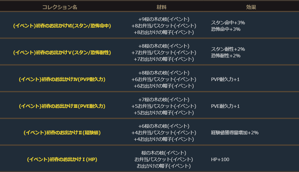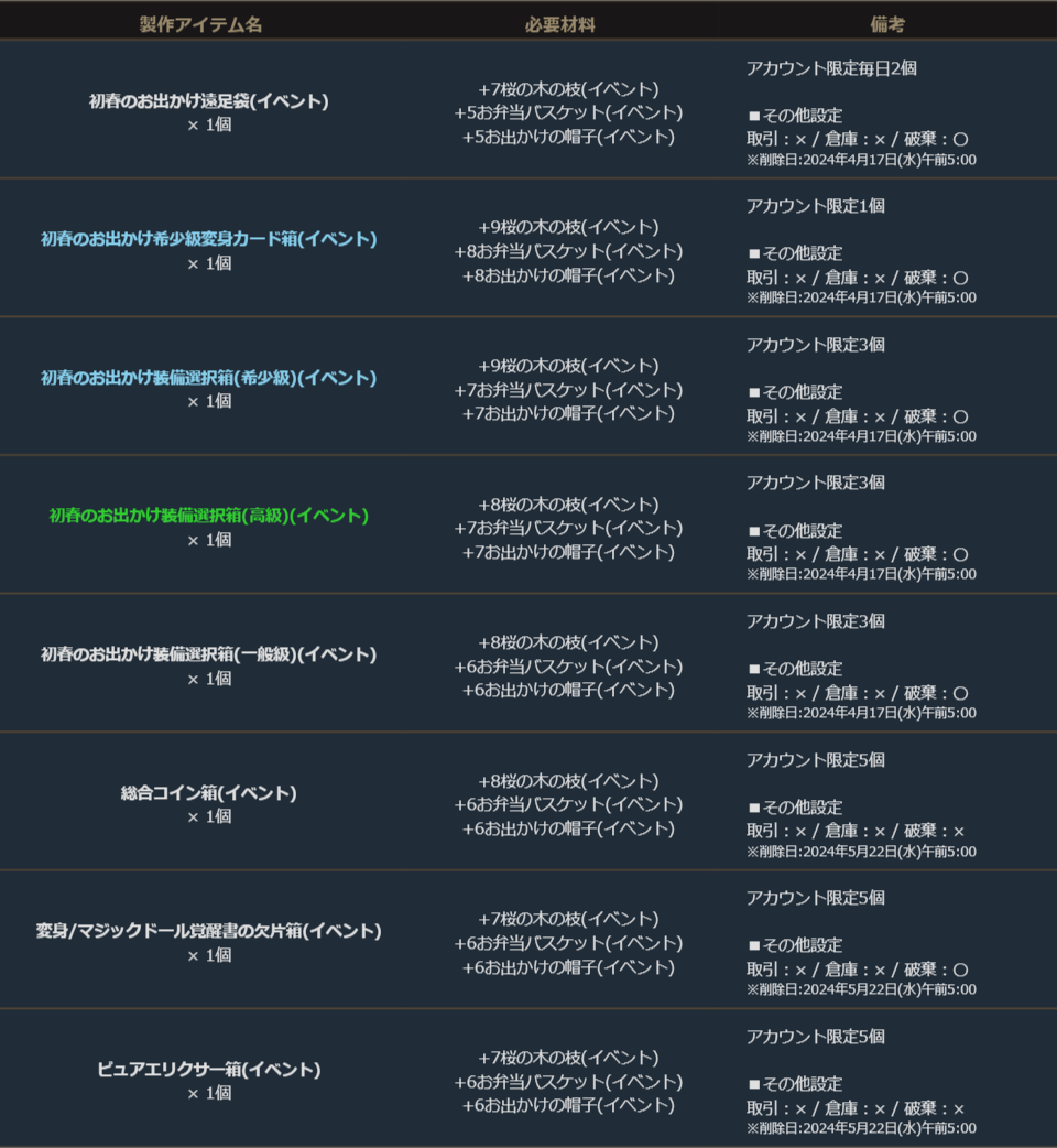 獲得した「桜の木の枝(イベント)」「お弁当バスケット(イベント)」「お出かけの帽子(イベント)」をそれぞれ一定の強化値まで強化する事で、下記のイベント製作の製作材料に使用する事ができます。