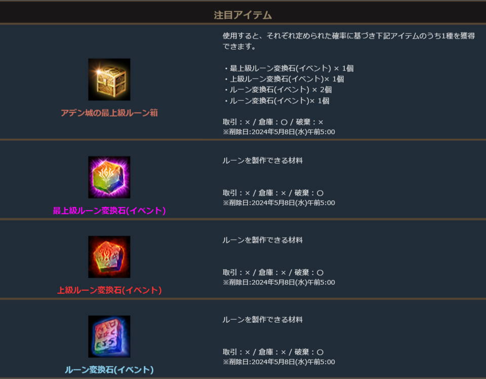 ※一部アイテムは未使用の場合、一定期間が経過すると自動で削除されます。詳しくは各アイテムの詳細をご確認ください。