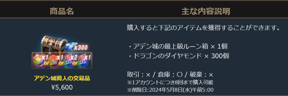 「ドラゴンのダイヤモンド300個」に加え、「アデン城の最上級ルーン箱」が獲得できるお得なパッケージです。