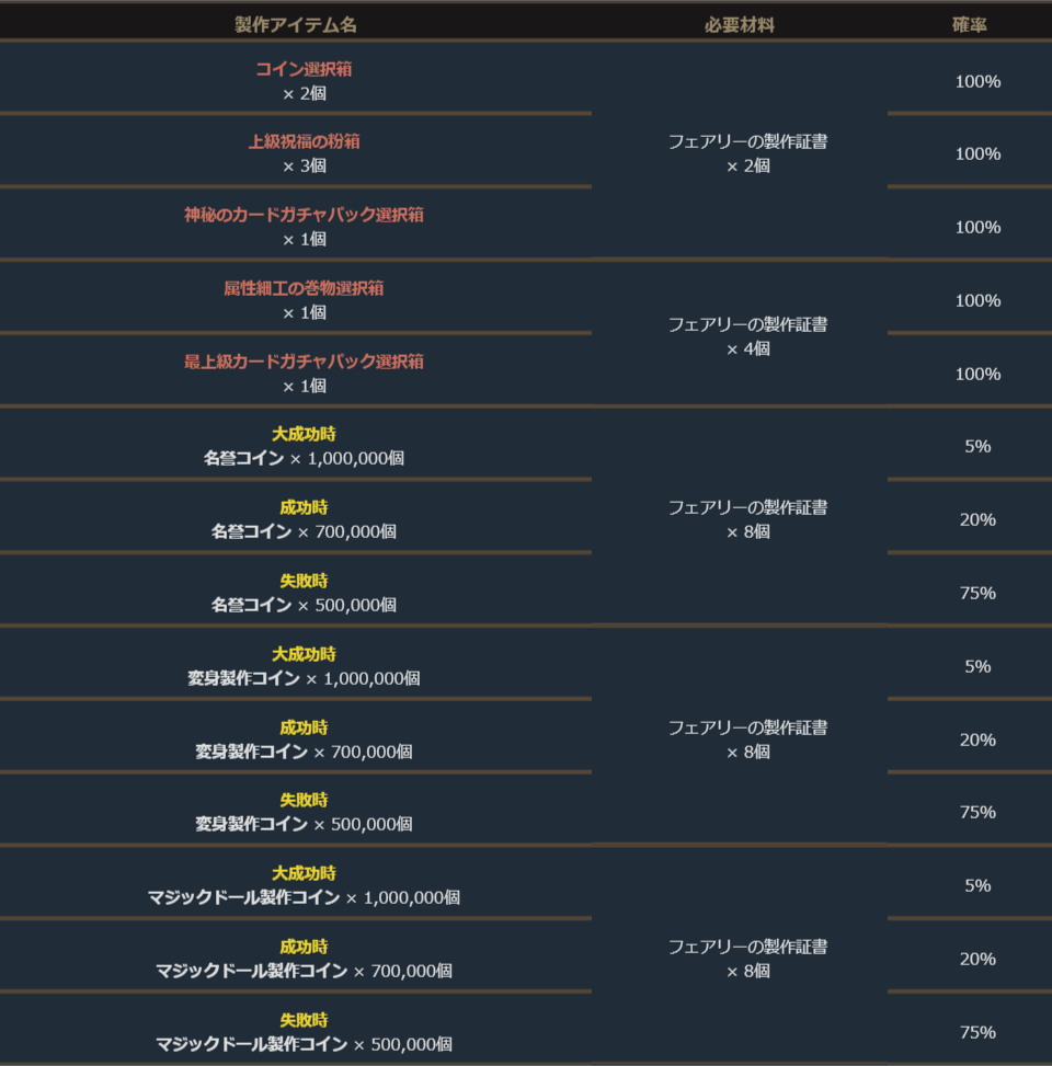 更に付属の「フェアリーの製作証書」で各種コインの製作などにチャレンジする事ができます。