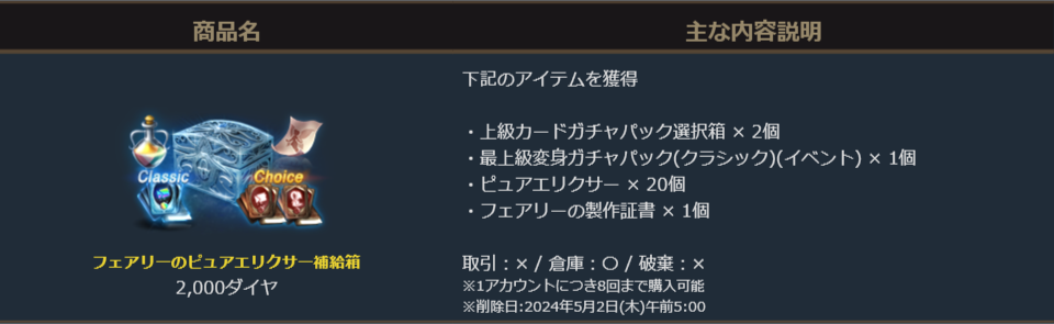 「最上級変身ガチャパック(クラシック)(イベント)」に加えて、「ピュアエリクサー」20個、「上級カードガチャパック選択箱」2個が獲得できます。