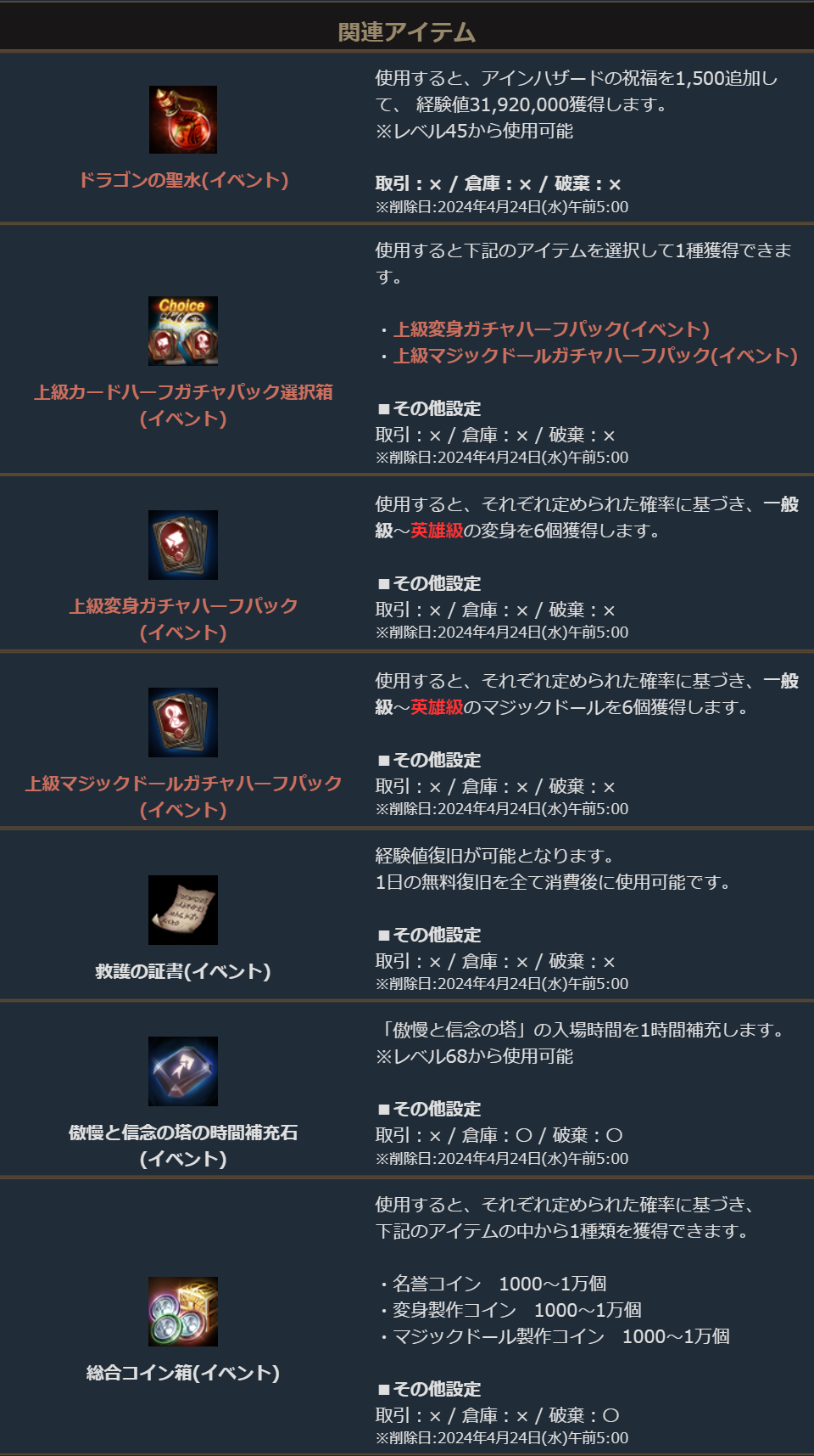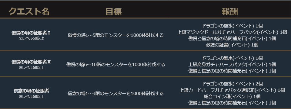 イベント期間中、「傲慢と信念の塔」のモンスターを討伐し、デイリークエストをクリアすることで「上級カードハーフガチャパック選択箱(イベント)」や「ドラゴンの聖水(イベント)」などを獲得できます。