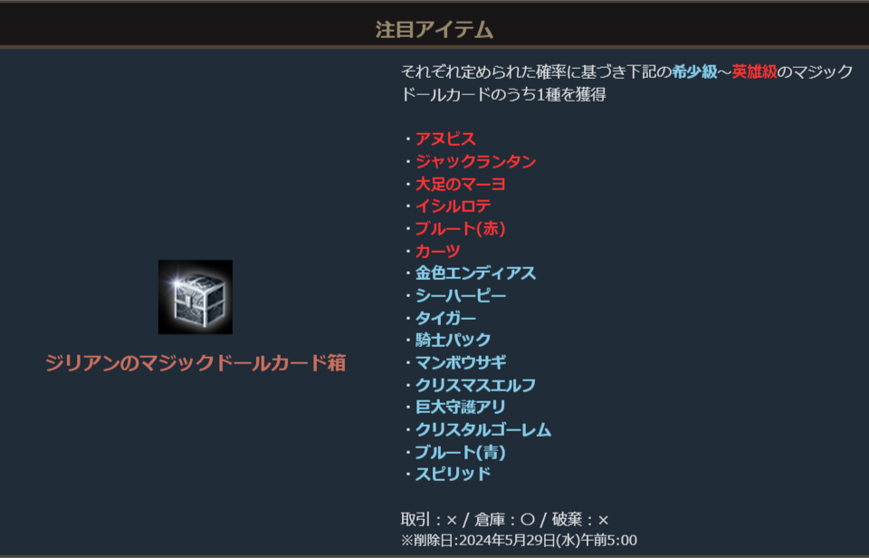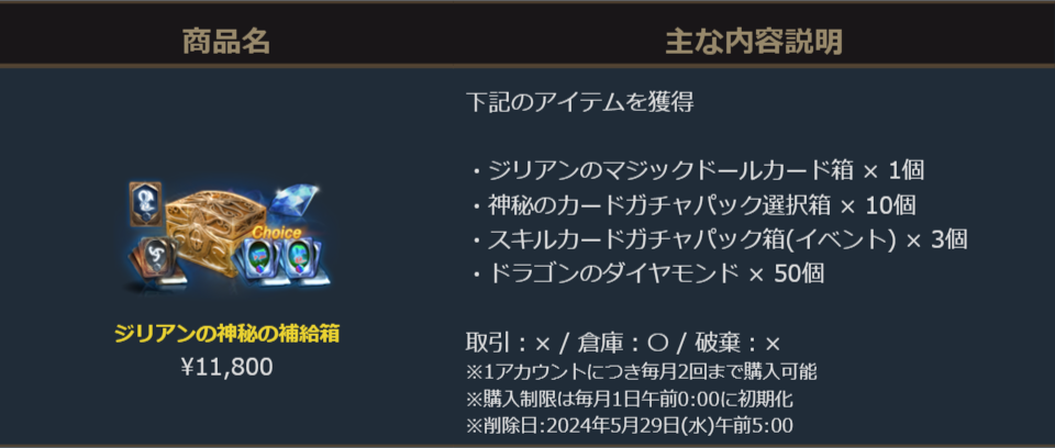 特定の希少級~英雄級マジックドールカードからなるリスト内のうち1種を獲得できる「ジリアンのマジックドールカード箱」に加え、「神秘のカードガチャパック選択箱」と「ドラゴンのダイヤモンド」が入った毎月2回まで購入可能なパッケージです。