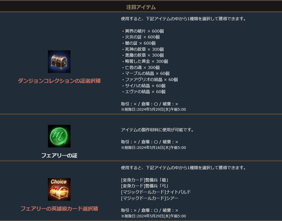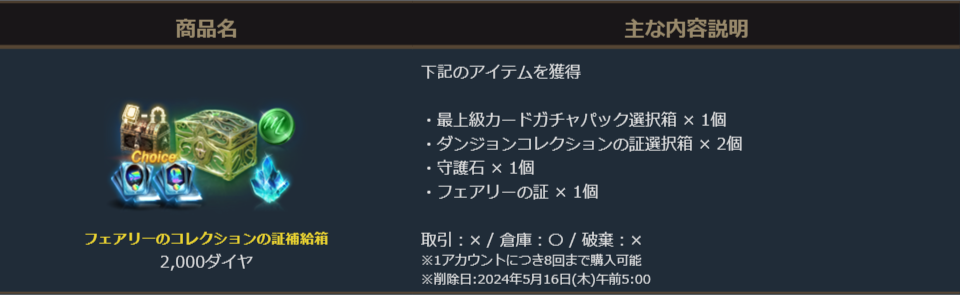 「最上級カードガチャパック選択箱」や「守護石」、選択したコレクションアイテムが手に入る「ダンジョンコレクションの証選択箱」などが獲得できます。