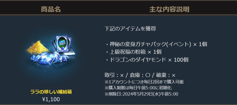 高級以上のカードが手に入る「神秘の変身ガチャパック(イベント)」と、爵位の昇級審査に使用が可能な上級祝福の粉が手に入る「上級祝福の粉箱」と一緒に「ドラゴンのダイヤモンド」が獲得できるお得なパッケージです。