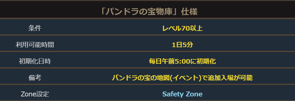 ダンジョン「パンドラの宝物庫」の入場条件は以下となります。