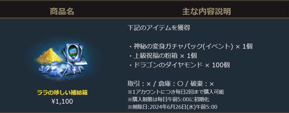 高級以上のカードが手に入る「神秘の変身ガチャパック(イベント)」と、爵位の昇級審査に使用が可能な上級祝福の粉が手に入る「上級祝福の粉箱」と一緒に「ドラゴンのダイヤモンド」が獲得できるお得なパッケージです。
