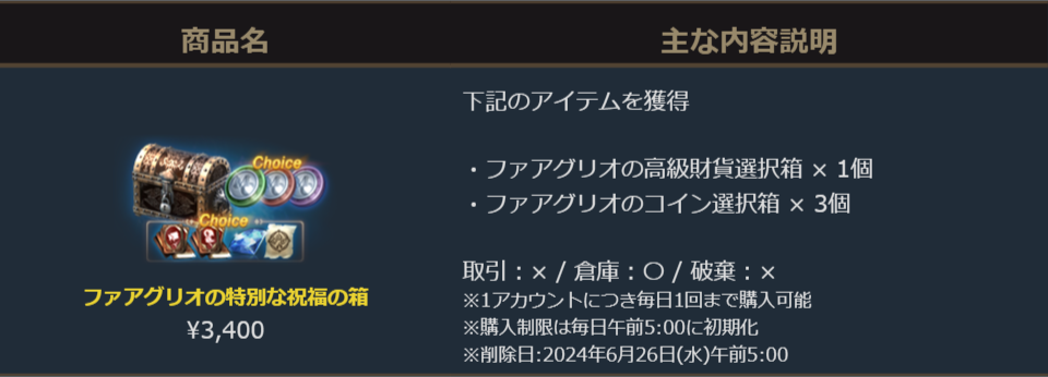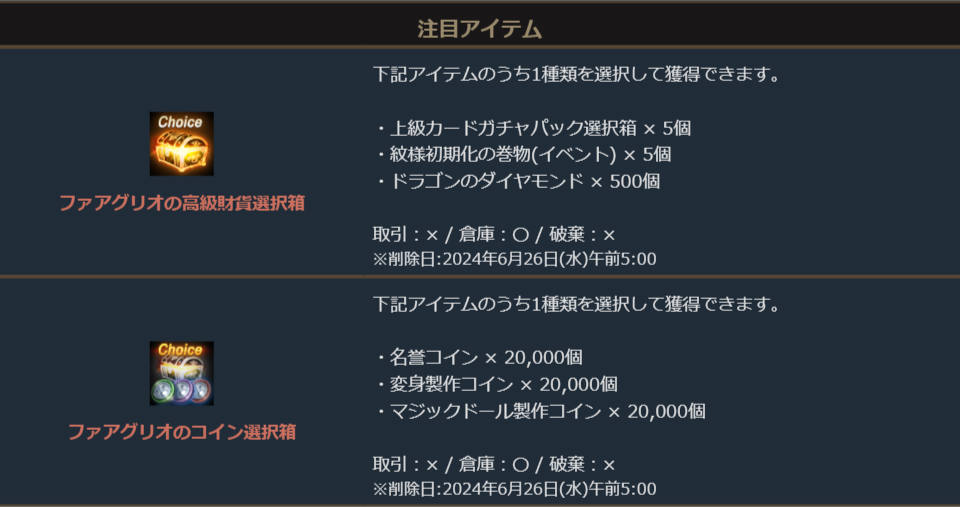 「上級カードガチャパック選択箱」5個、「紋様初期化の巻物(イベント)」5個、「ドラゴンのダイヤモンド」500個から一つを選択できる「ファアグリオの高級財貨選択箱」に加え、「ファアグリオのコイン選択箱」3個が入った毎日購入可能なパッケージです。