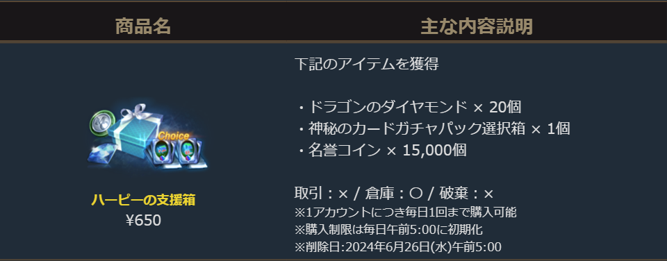 「ドラゴンのダイヤモンド」と一緒に「神秘のカードガチャパック選択箱」と「名誉コイン」がセットで手に入る、毎日1回だけ購入可能なお得なパッケージです。