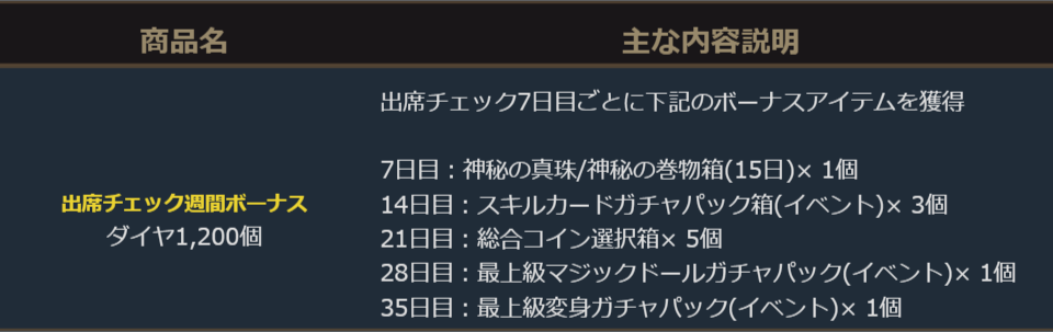通常の出席報酬に加えて、7日目ごとに追加報酬を獲得できるお得なパッケージです。