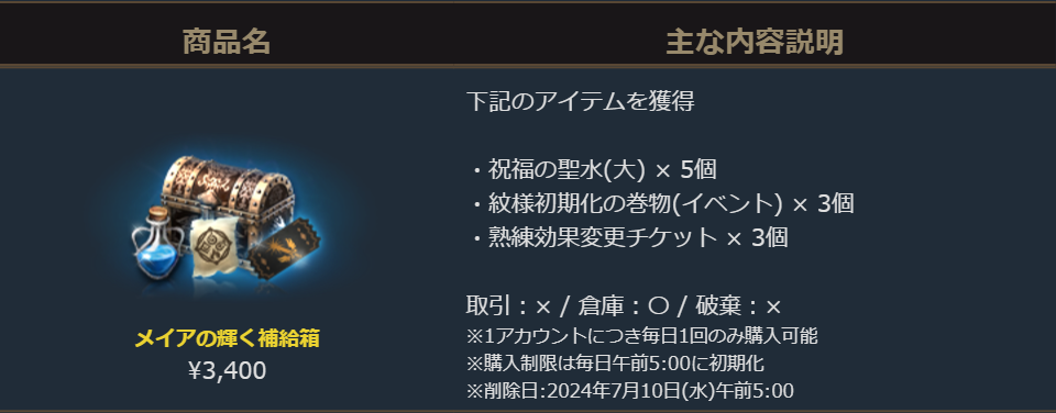 紋様の強化に使用する祝福ポイントが多く獲得できる「祝福の聖水(大)」と強化済みの紋様をリセットし強化に使用した祝福ポイントを取り戻すことができる「紋様初期化の巻物(イベント)」に加え「熟練効果変更チケット」がそれぞれ複数セットになった、紋様強化に便利なパッケージです。