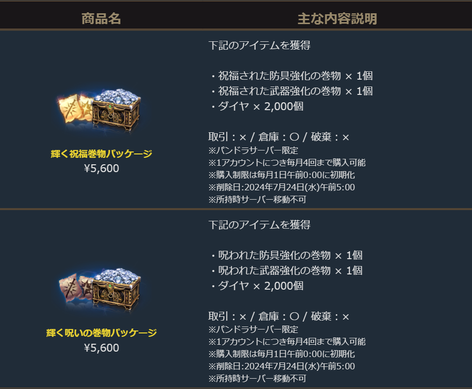 2024年6月12日より販売を開始しました「輝く祝福の巻物パッケージ」と「輝く呪いの巻物パッケージ」のご案内を申し上げます。