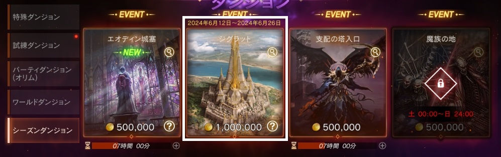 ジグラットはゲーム内メニューの「ダンジョン>シーズンダンジョン」より入場が可能です。