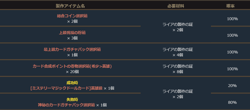 更に付属の「ライアの製作の証」で「[ミステリーマジックドールカード]英雄級」の製作などにチャレンジする事ができます。