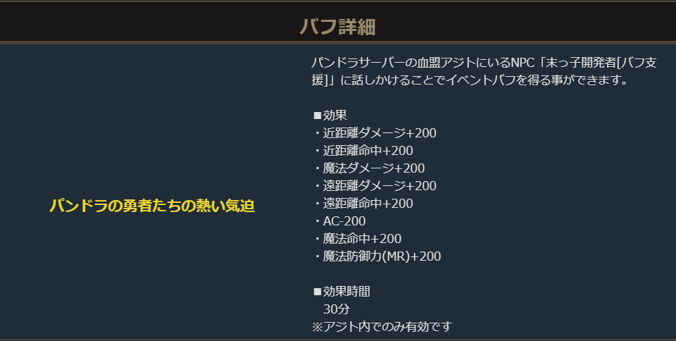 パンドラサーバー限定で血盟アジトにNPCが配置され、話しかけることでバフを得ることができます。