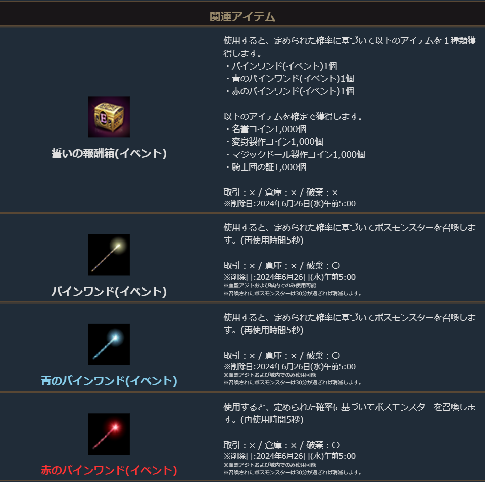 ※一部アイテムが期間終了後も未使用の場合、一定期間が経過すると自動で削除されます。詳しくは各アイテムの詳細をご確認ください。