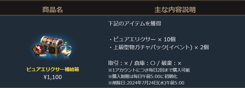 「ピュアエリクサー」10個と一緒に「上級聖物ガチャパック(イベント)」2個がセットで手に入る、毎日2回購入可能なお得なパッケージです。