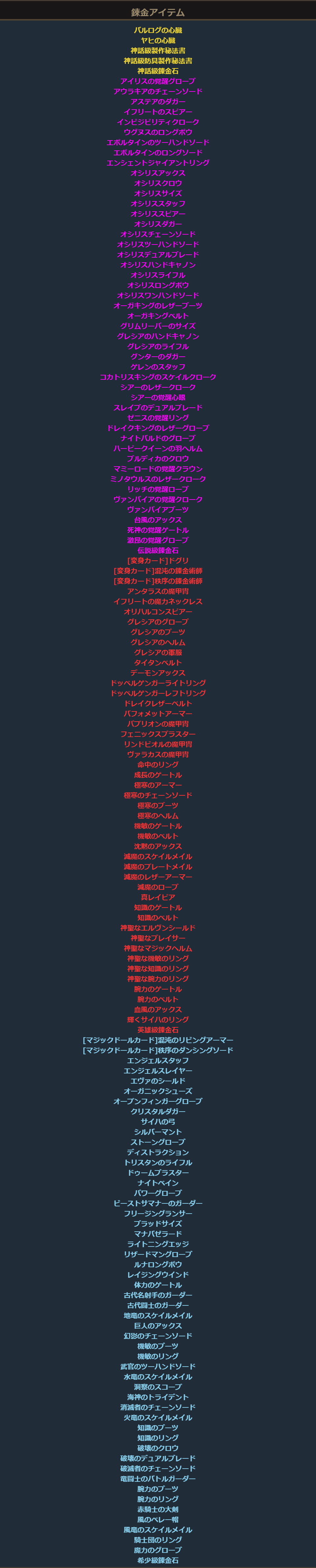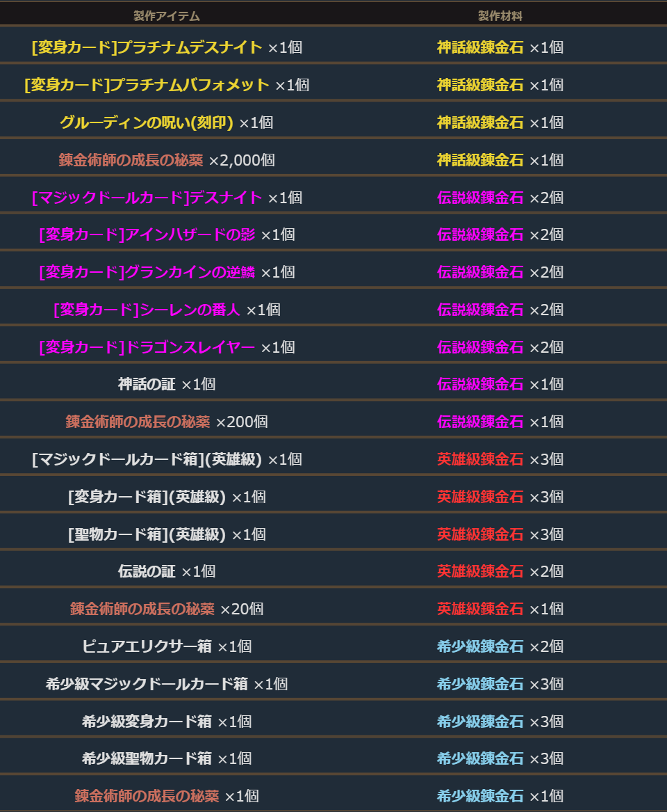※上記は神話級アイテムの錬金に挑戦する際の最低条件となります。錬金ルールの詳細は項目「■錬金ルール」をご確認下さい。