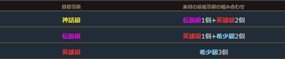 さらに「伝説級アイテム1個+英雄級アイテム2個」を材料にした場合「神話級アイテム」まで獲得が可能です。