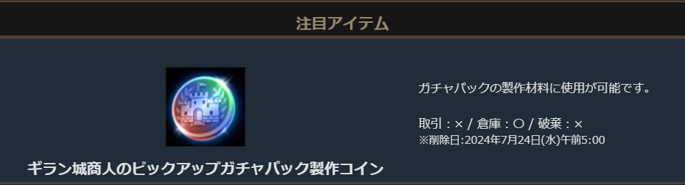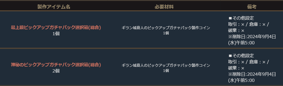 さらに付属の「ギラン城商人のピックアップガチャパック製作コイン」では「神秘のピックアップガチャパック選択箱(総合)」2個や「最上級ピックアップガチャパック選択箱(総合)」1個の製作をすることができます。