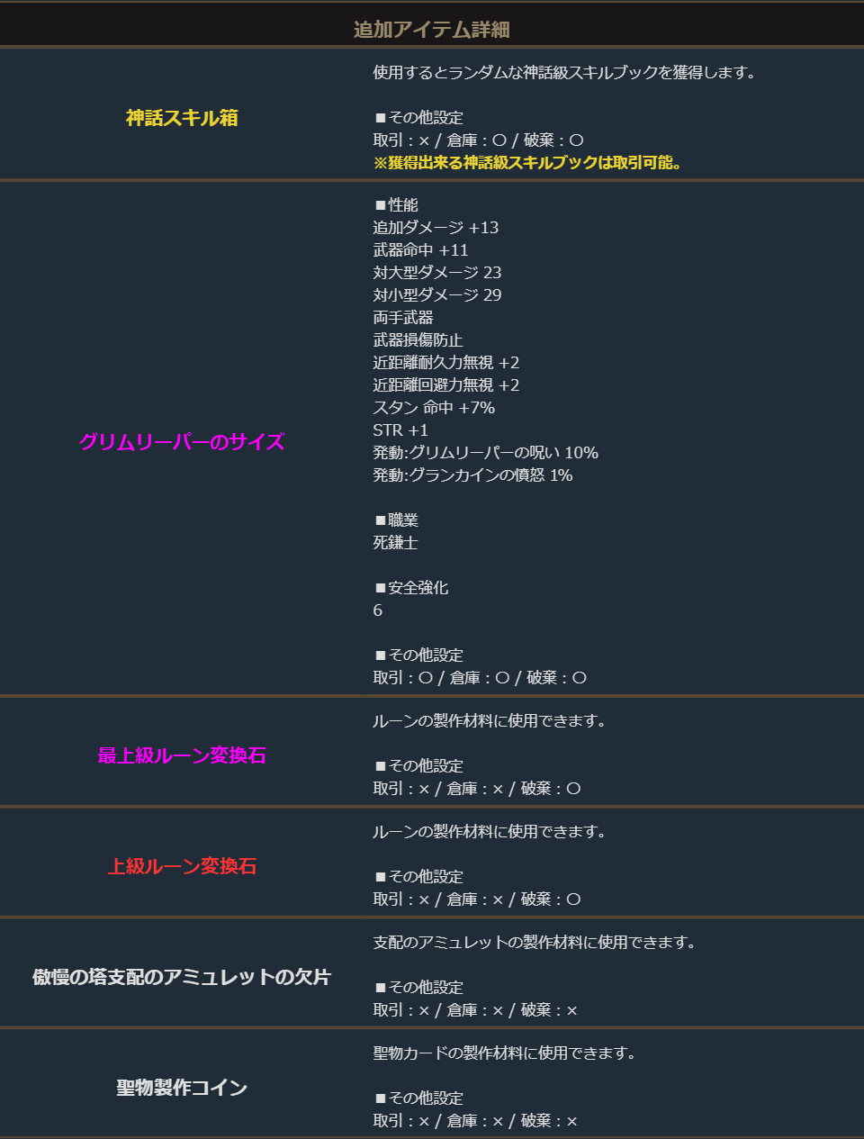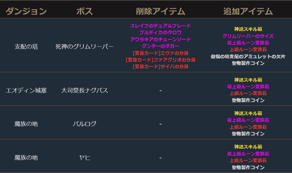 1.シーズンダンジョンに出現するボス達が強化されました。最大HP、AC、MR等のステータスが上昇しています。