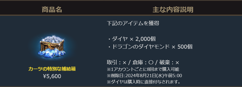 2,000ダイヤと「ドラゴンのダイヤモンド」500個がセットになったお得なパッケージです。