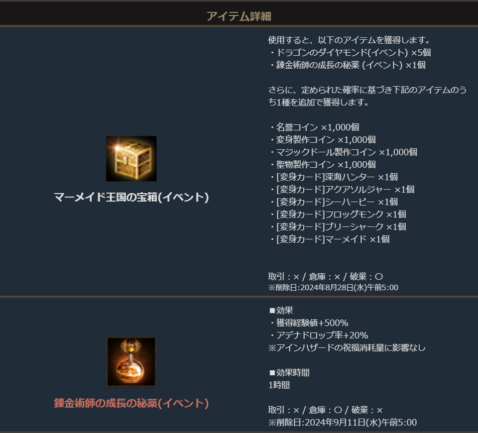 ※一部アイテムが期間終了後も未使用の場合、一定期間が経過すると自動で削除されます。詳しくは各アイテムの詳細をご確認ください。