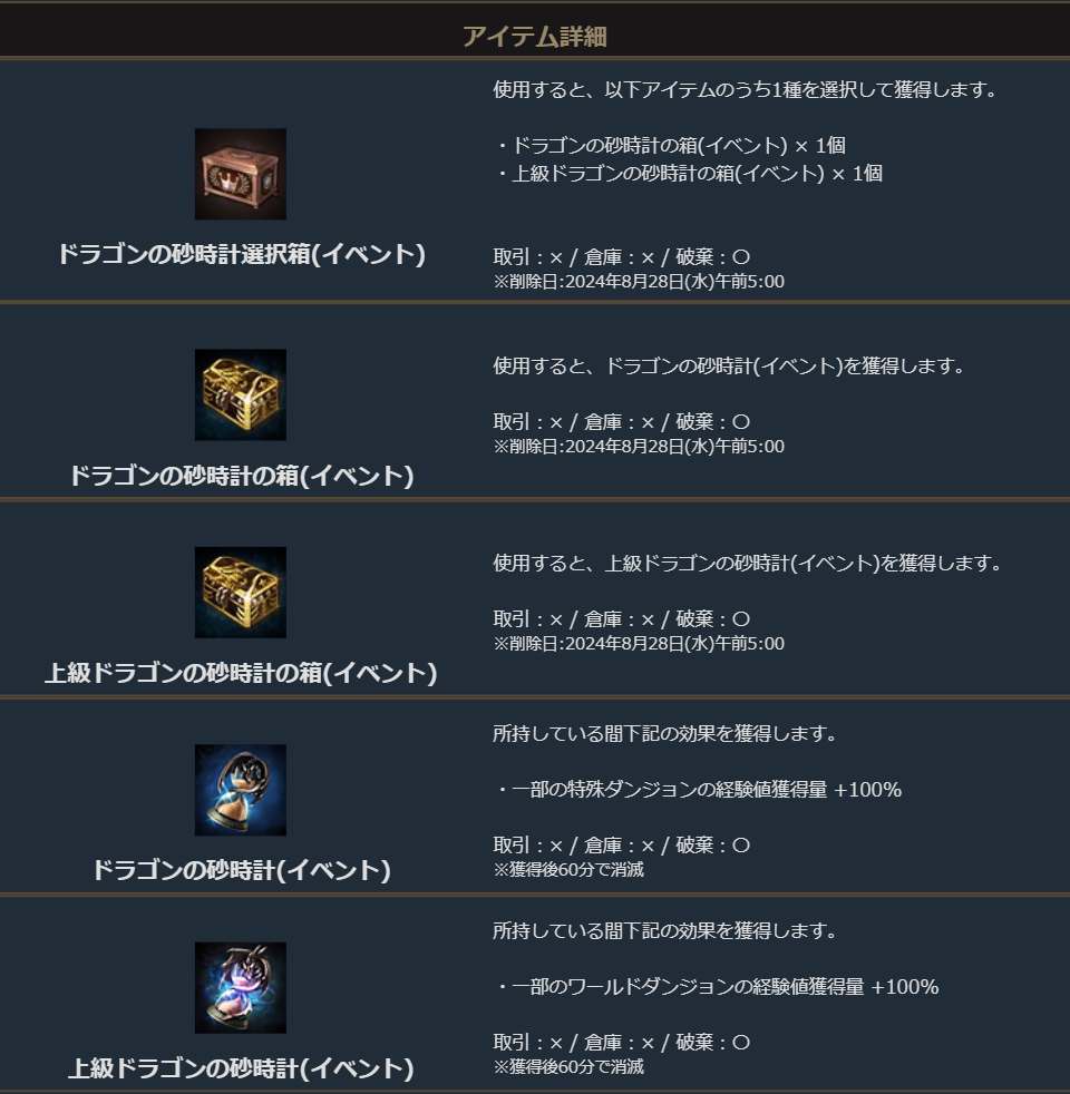 ドラゴンの砂時計はアイテムが消滅するまでの間、該当ダンジョンでの経験値獲得量増加バフが適用されます。是非キャラクターの強化にご活用下さい。