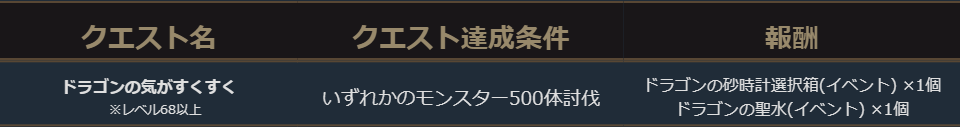 期間中、イベントクエスト「ドラゴンの気がすくすく」より「ドラゴンの砂時計選択箱(イベント)」の獲得が可能になります。