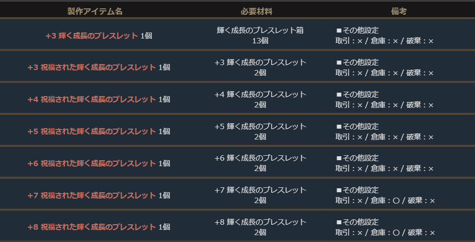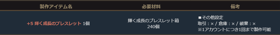 また、期間限定で「+5 輝く成長のブレスレット」を確定で製作する事が可能です。