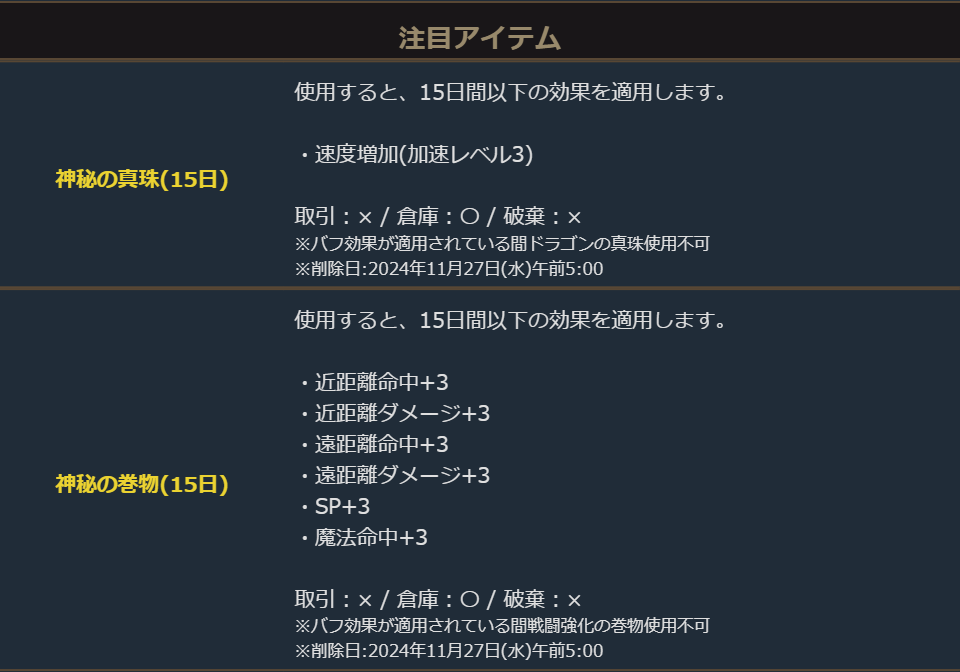 ※一部アイテムが期間終了後も未使用の場合、一定期間が経過すると自動で削除されます。詳しくは各アイテムの詳細をご確認ください。