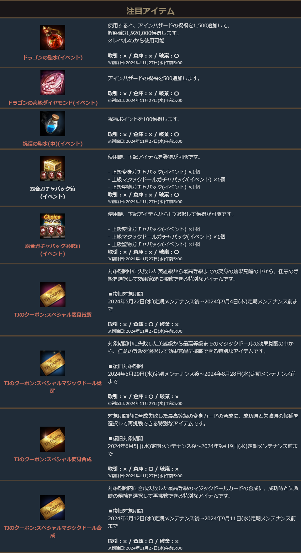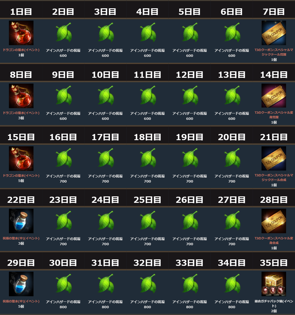多くのアインハザードの祝福に加え、「ドラゴンの聖水(イベント)」や各種「TJクーポン」が獲得できます。