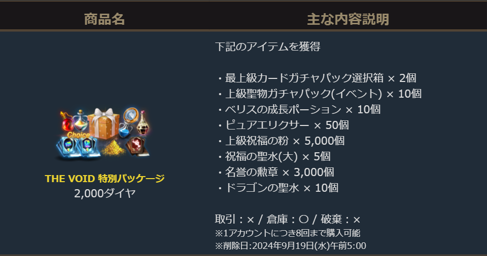 「最上級カードガチャパック選択箱」2個や「上級聖物ガチャパック(イベント)」10個をはじめとした様々なアイテムが含まれた8回まで購入可能な大変お得なパッケージです。