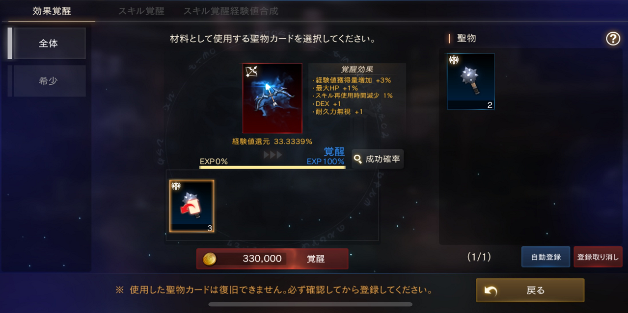 ゲーム内メニュー>聖物>覚醒>効果覚醒より、聖物カードを材料に聖物を覚醒させる事が可能です。