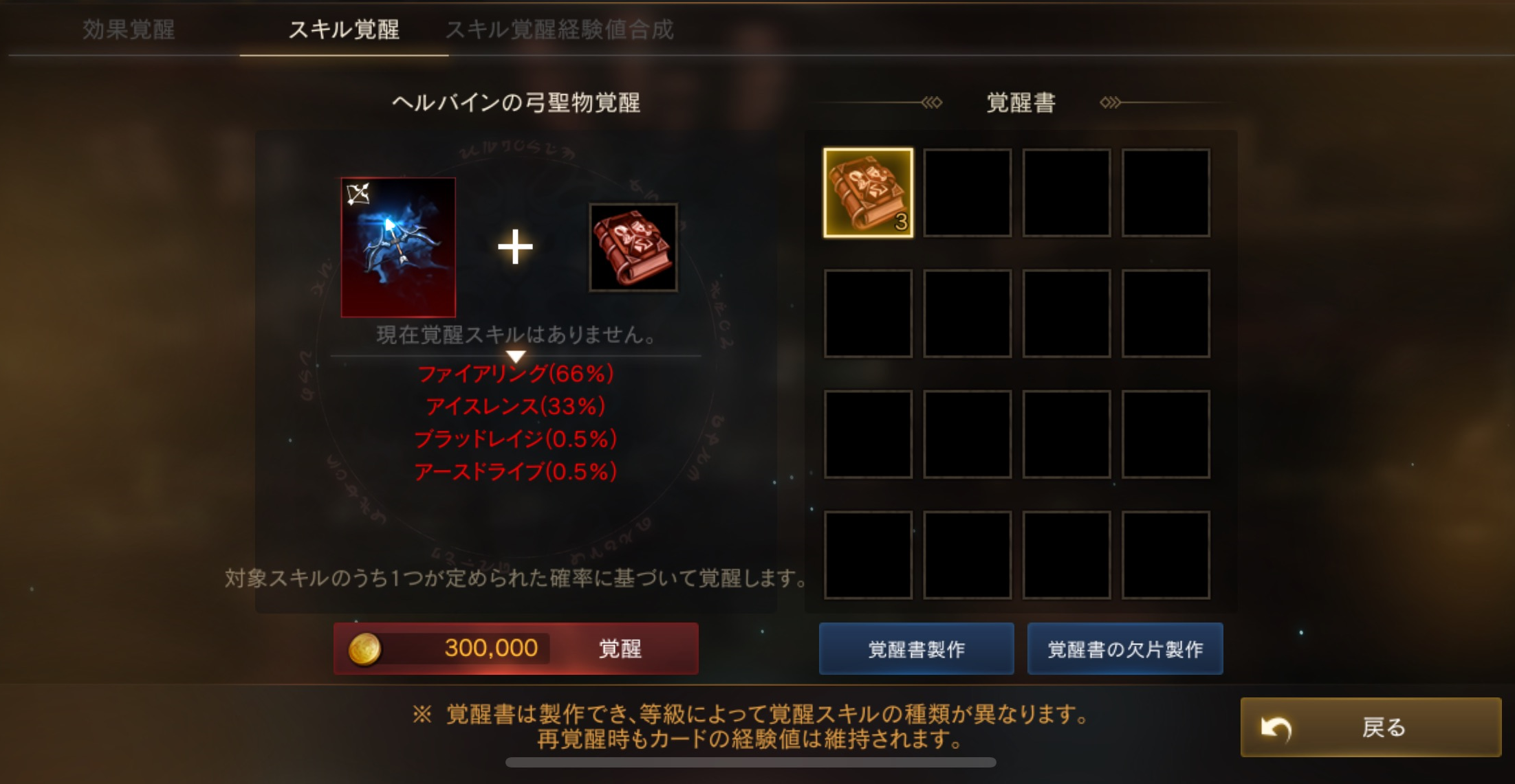 ゲーム内メニュー>聖物>覚醒>スキル覚醒より、「覚醒書」を使用してスキル覚醒が可能です。