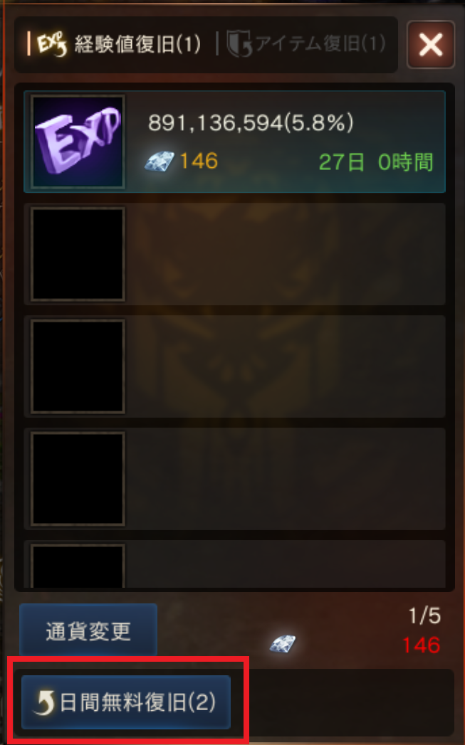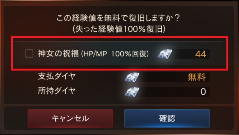 経験値復旧時、ダイヤを消費する事でHP/MPが100%回復できる「神女の祝福」機能が追加されました。