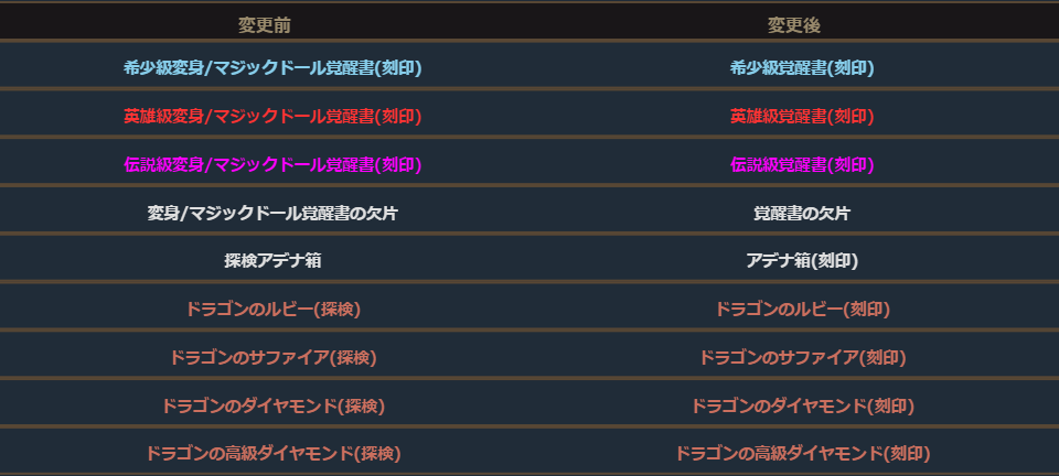 また、聖霊収集の実装に合わせて一部のアイテム名が変更されました。