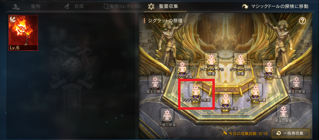 希少級以上、かつスキル覚醒レベルが5以上に到達している聖物をジグラットの祭壇に配置し、聖物の収集結果に応じて聖物の経験値と報酬アイテムを獲得出来るコンテンツです。
