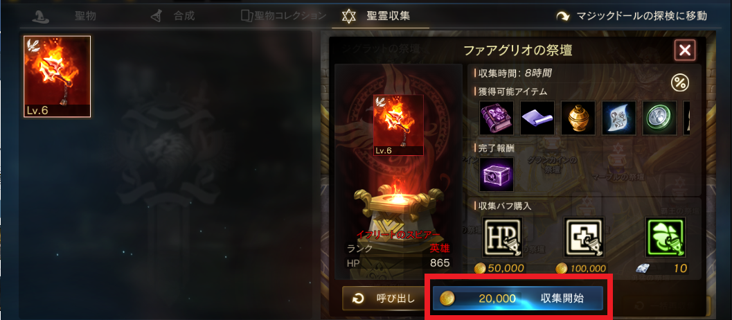 3.配置する聖物カードを選択した後、「収集開始」ボタンで開始されます。