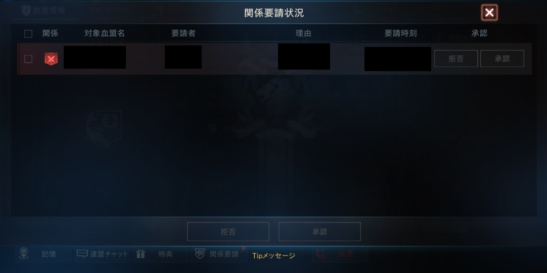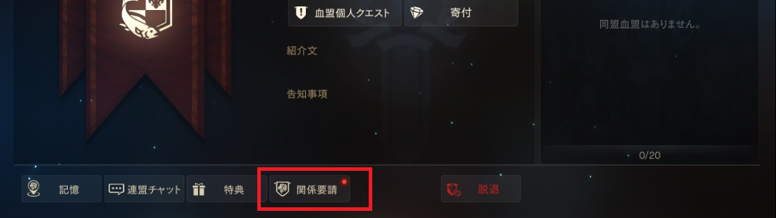 要請内容はゲーム内メニュー>血盟>関係要請から管理可能です。