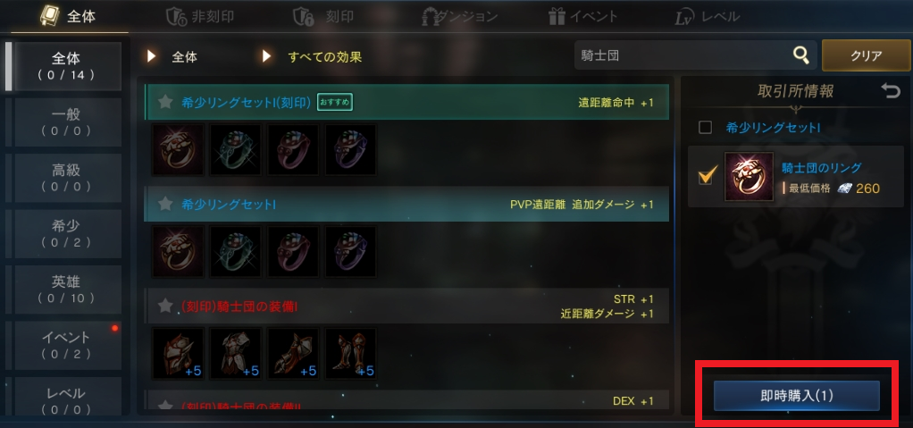 各コレクション名を選択すると右側に「取引所情報」メニューが表示され、購入するアイテムにチェックを入れて「即時購入」ボタンを押すと購入できます。