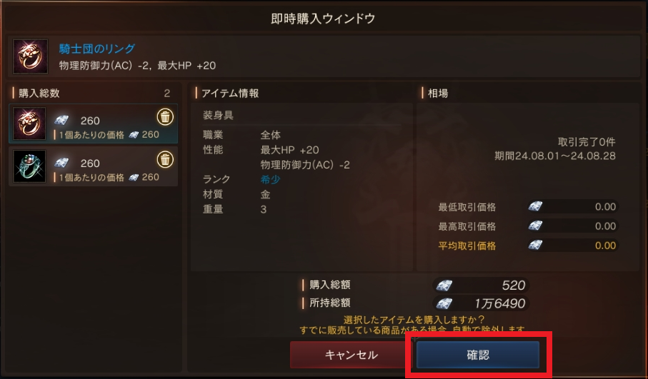 アイテム情報、相場等の情報が表示されます。「確認」ボタンを押下すると購入が完了します。