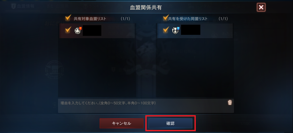 共有対象の敵対血盟と共有先の同盟血盟をそれぞれ選択し、「確認」ボタンを押下すると共有されます。