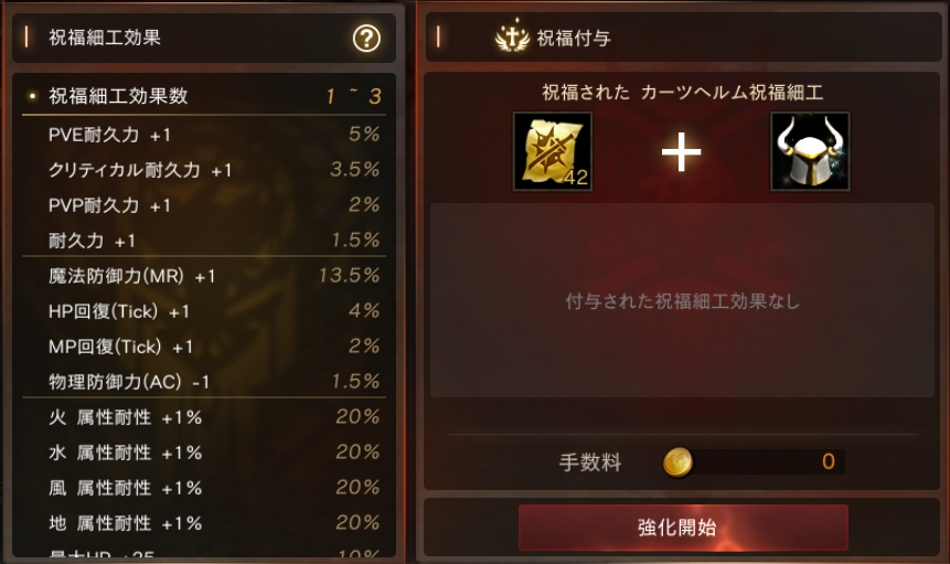 防具祝福細工時、定められた確率に基づいて、下記のいずれかの祝福細工効果が付与されます。