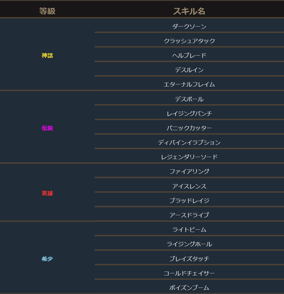 ※覚醒時、等級毎に決まったスキルが定められた確率に基づいてランダムに習得され、再度覚醒するとスキルの再抽選を行う事ができます。
