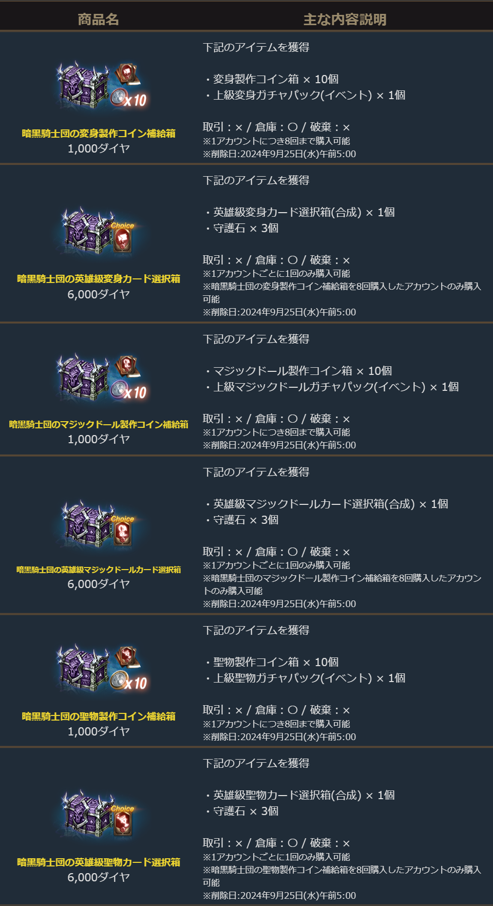 2024年9月11日より販売を開始いたします「暗黒騎士団の製作コイン補給箱」のご案内を申し上げます。
