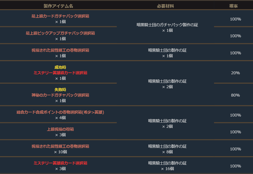 さらに、「暗黒騎士団のガチャパック製作の証」では「最上級カードガチャパック選択箱」や「最上級ピックアップガチャパック選択箱」の製作、「暗黒騎士団の製作の証」では「ミステリー英雄級カード選択箱」の製作にチャレンジすることができます。