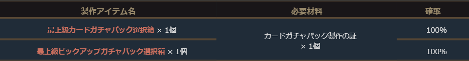 さらに付属の「カードガチャパック製作の証」では「最上級カードガチャパック選択箱」1個か「最上級ピックアップガチャパック選択箱」1個の製作ができます。