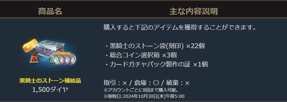 2024年10月10日より販売を開始しました「黒騎士のストーン補給品」のご案内を申し上げます。