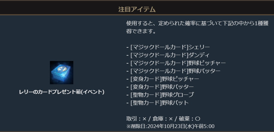 ※一部アイテムが期間終了後も未使用の場合、一定期間が経過すると自動で削除されます。詳しくは各アイテムの詳細をご確認ください。